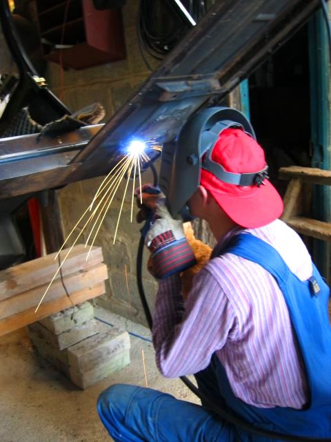 Man schweißt Oldtimer-Porsche-Autorahmen, Funken fliegen. SDF