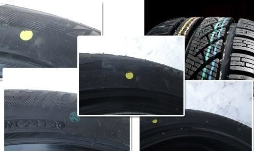 Как правило, на внешних боковых поверхностях наносятся цветные пятна (желтые, белые, зеленые и т.д.) размером 5-10 мм, они размещены ближе к внутреннему диаметру покрышки. Каждый производитель, маркируя шину, тем самым предоставляет покупателю дополнительную информацию об изделии. Так, например, желтое пятно на боковой поверхности колеса говорит о том, что это самая легкая его часть. Таким образом, при установке покрышки на диск стоит учитывать эту информацию, и для более точной балансировки, необходимо совмещать эту метку со штуцером.