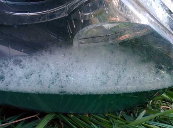 Если в качестве очистительной жидкости был использован раствор дистиллированной воды и моющего для посуды, важно в конце ополоснуть оптику чистой водой. Опять же, она должна быть дистиллированной. Если этого не сделать, на фаре будут ярко выражены мыльные разводы.