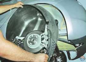 вначале самостоятельно снимаем защиту колес, которая закреплена саморезами. Для этого при помощи отвертки откручиваем 3-4 самореза, фиксирующие передние подкрылки;