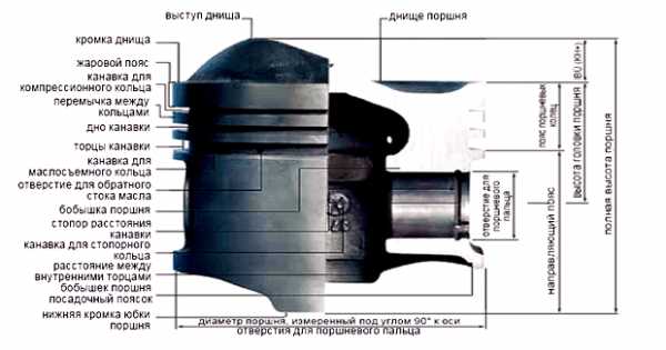Обсудим основные детали поршня, более подробно устройство поршня можно рассмотреть на схеме.