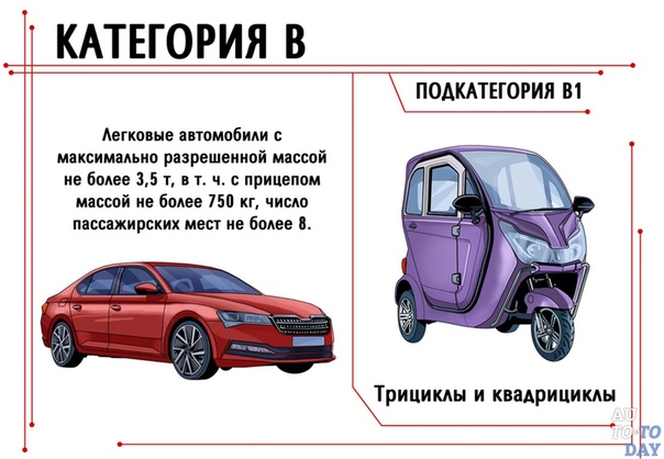 В1 — квадро- и трициклами, мотоколясками и другими трехколесными (четырехколесными) транспортными средствами, разрешенная максимальная масса не больше 400 кг;