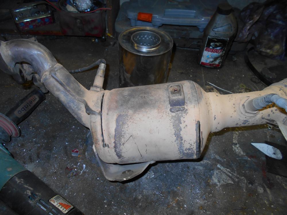 Начинаем работу с демонтажа автомобильного глушителя, поскольку нам необходимо вырезать старый катализатор. Труба, внутренний диаметр диаметра, должен полностью совпадать по размеру с демонтированным катализатором, поскольку в сделанный им пламегаситель будет установлен вместо него.