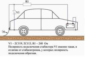 Ещё раз повторюсь, для работы схемы защиты нам не требуется ток, протекающий между электродами. Если он будет, то это будет “побочный” ток, который может возникнуть в результате намокания анодов, колёс автомобиля и т.д. Это ток разряжающий аккумулятор и не более того. Поэтому автомобильную бортовую сеть + 12 вольт достаточно подключить к аноду (нескольким анодам) через добавочный резистор. Основное назначение резистора – ограничение тока разряда аккумуляторной батареи в случае замыкания анода на катод, которое может произойти по причинам “неудачной установки”, повреждения анода, его химического разложения в результате окисления и т.д.