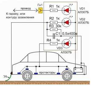 2. Использование контура заземления в качестве анода подобно использованию металлического гаража. Разница состоит лишь в том, что главным образом от коррозии защищается днище автомобиля. Для создания лучшего контура заземления, по периметру автомобиля необходимо забить в грунт четыре металлических кола (стержня) длиной не менее одного метра. Колы, электрически соединяются друг с другом с помощью проволоки. Контур подключается к автомобилю точно так же, как и корпус гаража – через добавочный резистор.