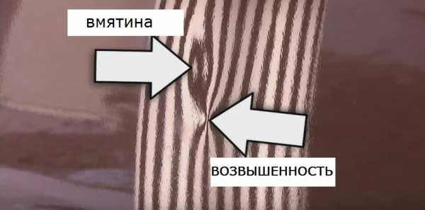 - При использовании отражающей панели с полосами, нужно, чтобы отражение расходящихся линий изменилось на параллельные. Вмятина определяется по расходящимся линиям, а выпуклость – по сходящимся.