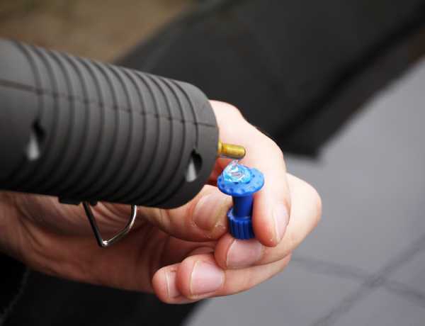 Работу лучше всего проводить в теплый летний день. Вернее даже жаркий. Включаем клеевой пистолет в сеть, даем ему разогреется и аккуратненько наносим клей в центре вмятины, диаметром чуть больше диаметра шляпки болта. Быстро прижимаем болт шляпкой к нанесенному клею. Даем чуть подостыть и дальше наносим клей уже поверх шляпки болта так, чтобы он схватился с клеем, выступившим из-под шляпки болта. Даем клею высохнуть некоторое время. У меня клей сох с полчаса пока я пиво пил.