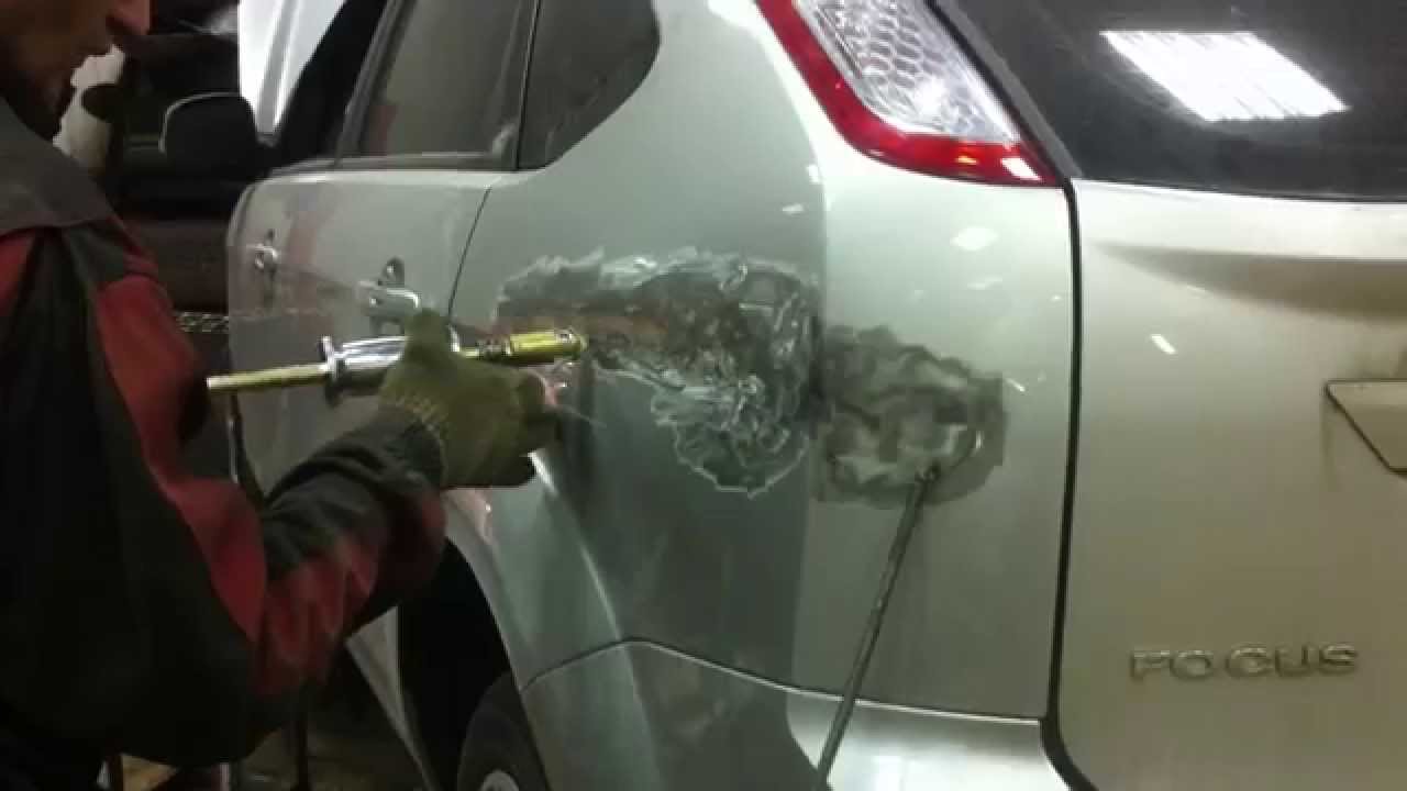 Просто не хватает сил, чтобы ее выдавить либо она расположена в неудобном для воздействия месте. В таком случае можно прогреть вмятину изнутри термофеном, но не переусердствовать, чтобы не вздулась краска. Не стоит допускать нагрев краски свыше 100-110° С.