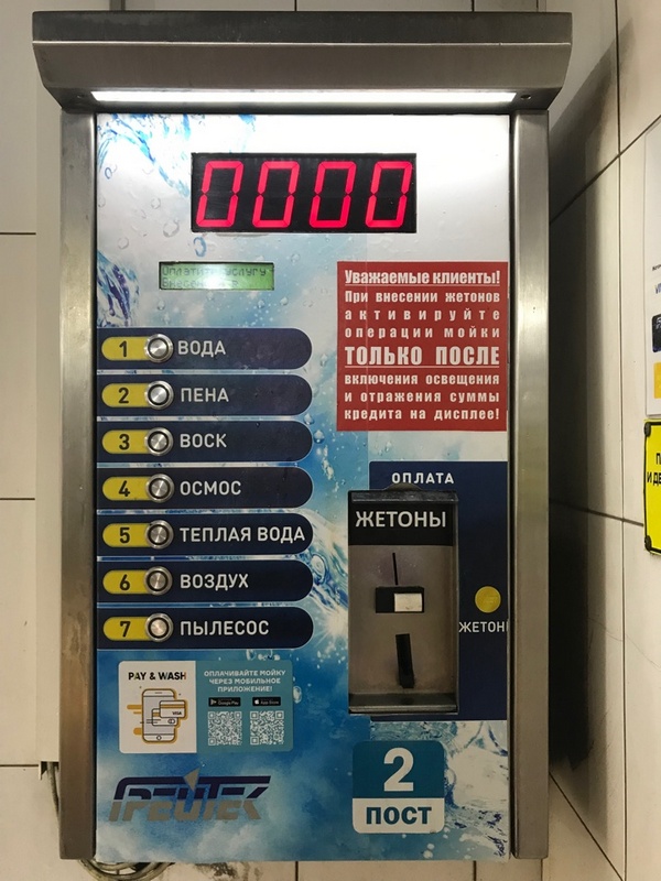 В нашем случае 1 жетон — это 1,5 минуты работы мойки, чего достаточно для одного круга. Лишь воск можно наносить ускоренно, за секунд 40, его много для кузова не нужно.