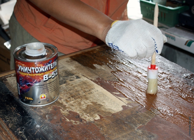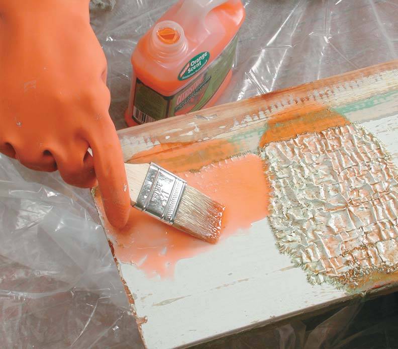Когда средство для снятия краски впитается, можно использовать металлический или пластиковый скребок, чтобы отодвинуть слои краски.
