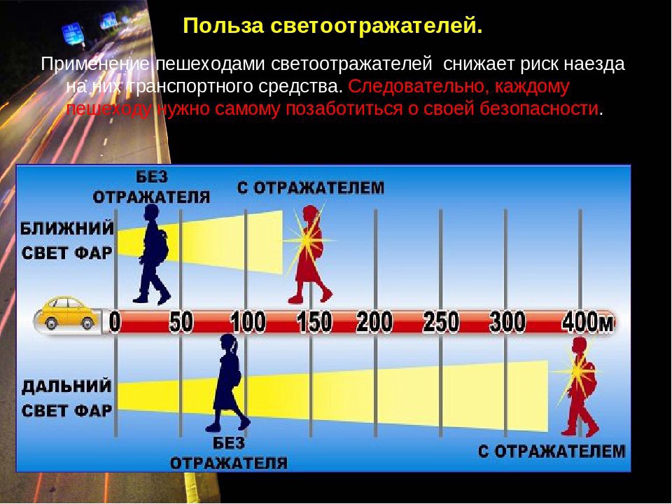 Самый оптимальный вариант, когда на пешеходе находится как минимум 4 световозвращателя. Световозвращатели – элемент безопасности, который действительно может помочь сохранить жизнь пешим участникам движения.