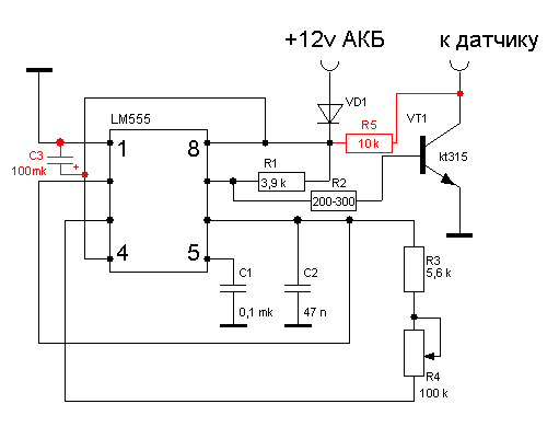 Кроме того, в цепи должен присутствовать защитный диод для защиты электрической цепи от изменения полярности. Указанные на схеме номиналы резистора и конденсатора вполне подходят для генерации прямоугольных импульсов с амплитудой 12 В, в диапазоне низких и высоких частот (от 180 Гц до 1,5 кГц). Эти характеристики с лихвой покрывают потребности данного устройства на разных автомобилях.