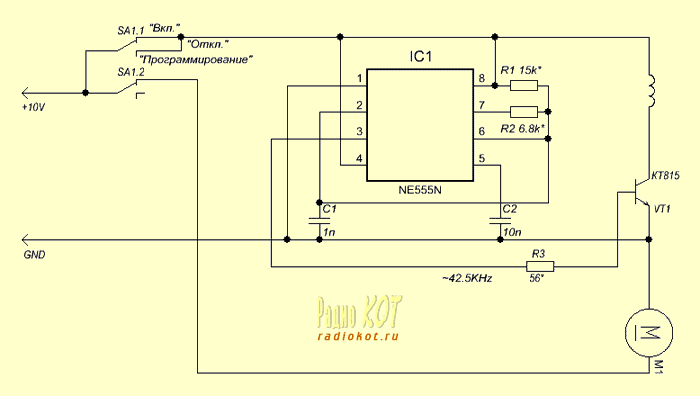 Следующая схема, с тем же принципом работы генератора, построена на микросхеме 555 (1006VI1).