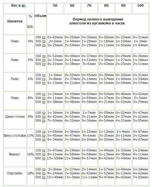 | Водка, 40% | 100 | 5 ч 50 м | 5 ч | 4 ч 20 м | 3 ч 50 м | 3 ч 30 м |