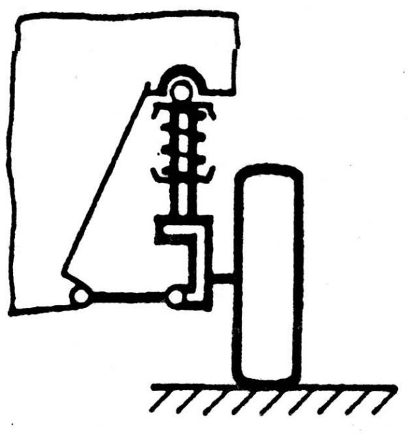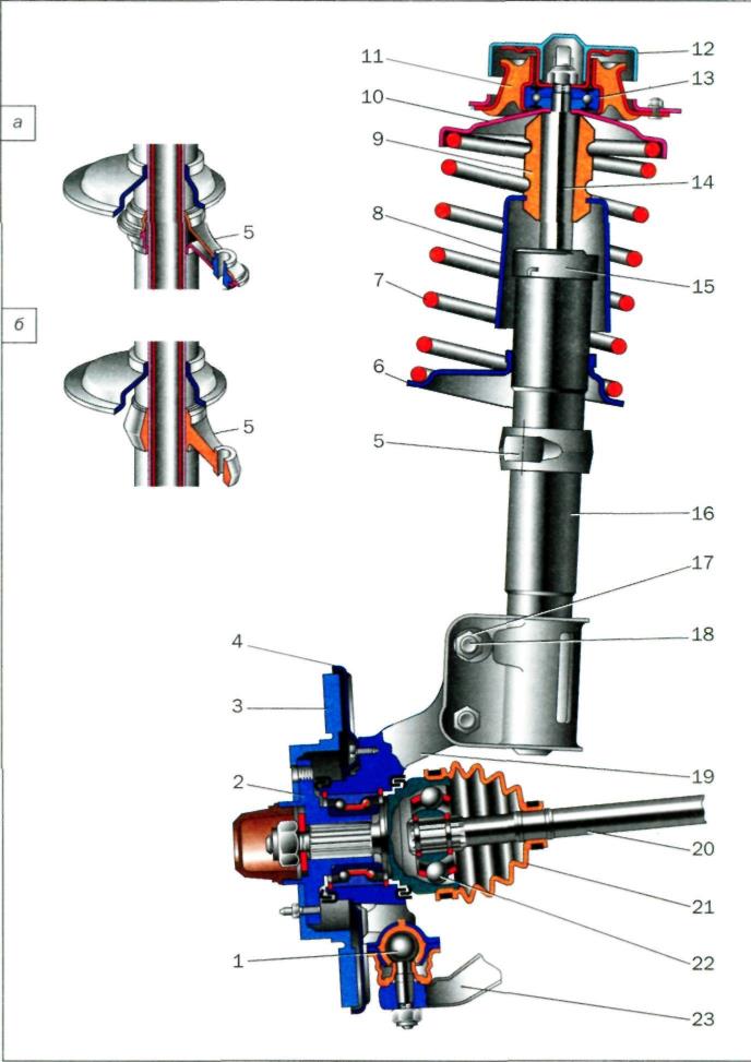 Резиновые подушки позволяют компенсировать перекосы, возникающие при качании такого составного рычага, а также гасят продольные вибрации, передаваемые от колеса на кузов.Шток телескопической стойки закреплен на нижнем основании резинового блока верхней пяты и не поворачивается вместе со стойкой и установленной на ней пружиной. В таком случае при любых поворотах управляемых колес стойка также поворачивается относительно штока, снимая трение покоя между штоком амортизатора и его направляющей, поршнем амортизатора и цилиндром, что улучшает реагирование подвески на малые дорожные неровности.Пружина устанавливается не соосно стойке, а наклонена в сторону колеса для того, чтобы уменьшить поперечные нагрузки на штоке, его направляющей и поршне, возникающие под воздействием вертикального усилия на колесе.Особенностью подвески управляемых колес является то, что она должна позволять колесу совершать повороты независимо от прогиба упругого элемента. Это обеспечивается с помощью так называемого шкворневого узла.