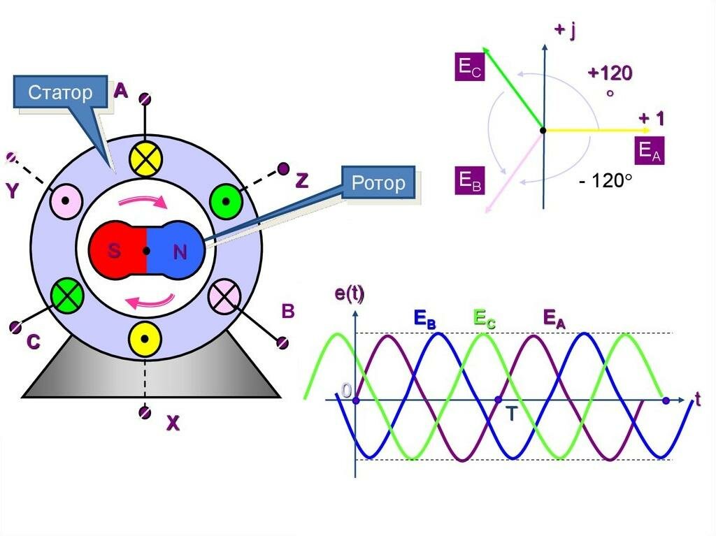 Основа работы генератора заключается в использовании электродвижущей силы (ЭДС), которая образуется в прямоугольном контуре, вращающемся в однородном вращающемся магнитном поле.