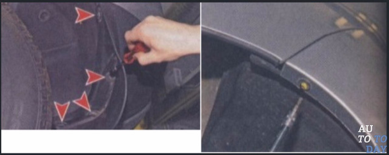 На втором этапе удаляются брызговики, которые крепятся посредством саморезов и пластиковом пистоне. Последний снимается с помощью отвертки.