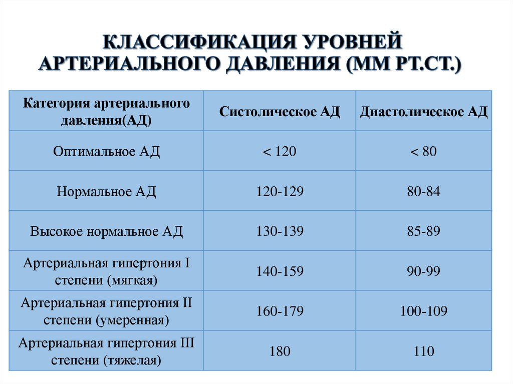 Артериальное давление бывает систолическое (сердечное, «верхнее») — его обозначает верхнее число в показателе и диастолическое (почечное, «нижнее») — нижнее число. Может фиксироваться повышенное, пониженное и нестабильное артериальное давление.
