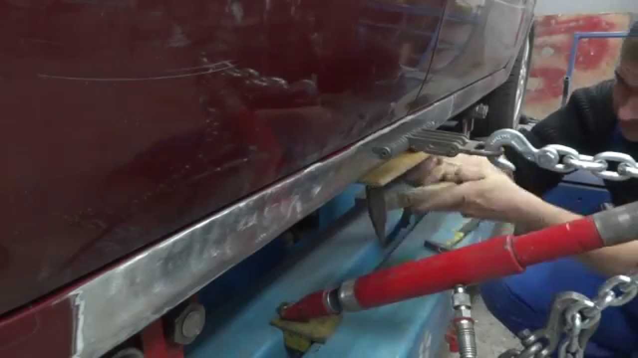 Перед проведением работы, демонтируют передний указатель поворота и фару. Со стороны вмятины домкрат упирается пяткой (под нее предварительно подкладывают резиновый брус), рычаг устройства должен упираться в противоположный край проема. Операцию прекращают после выправки дефекта, а поврежденный участок покрывают шпатлевкой.