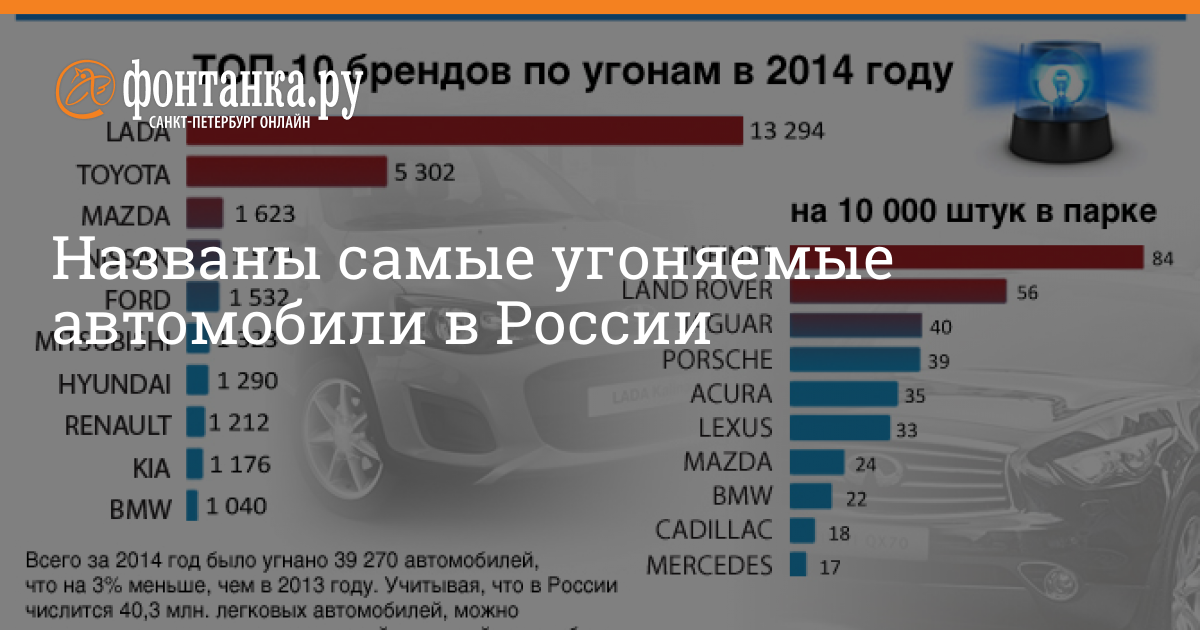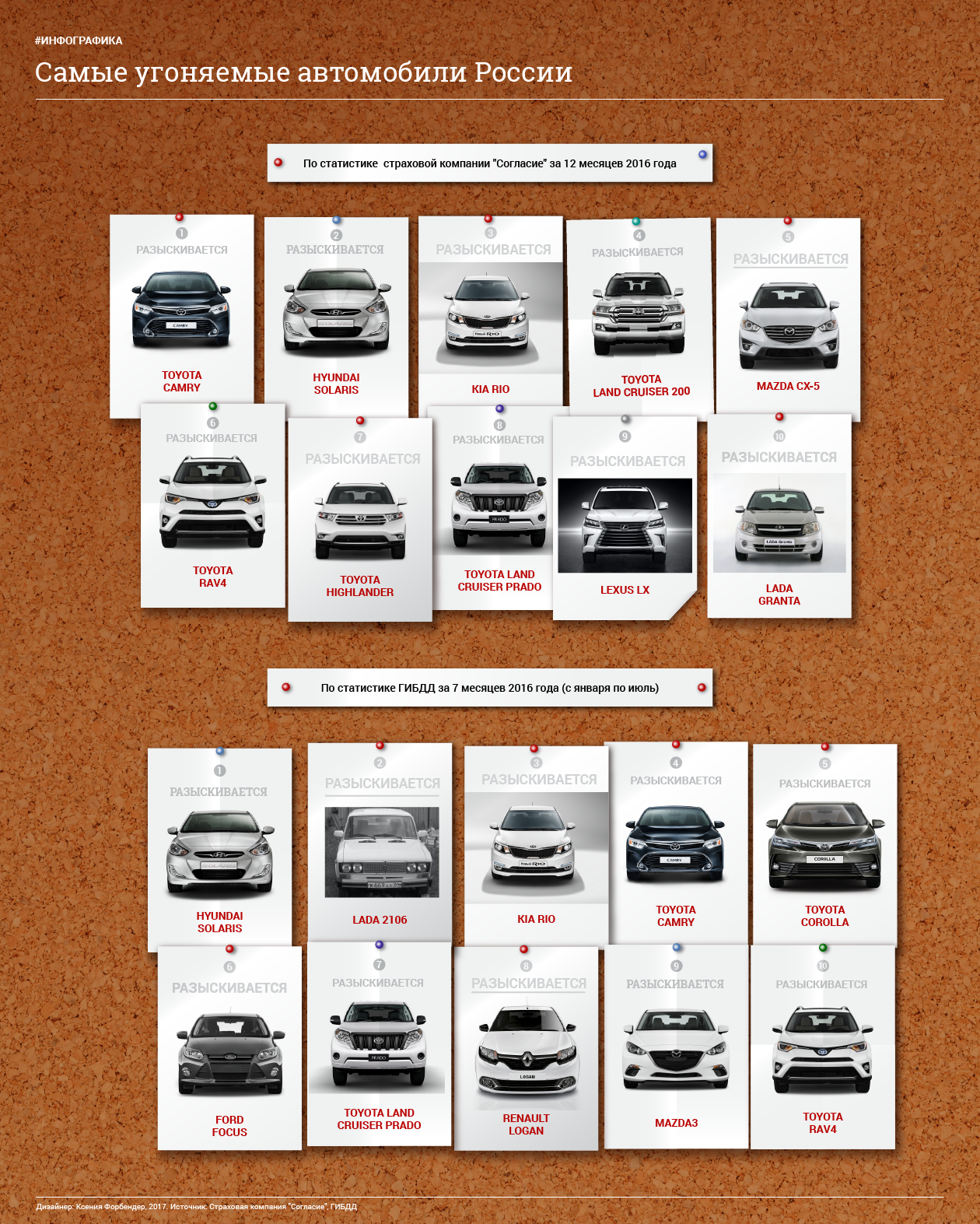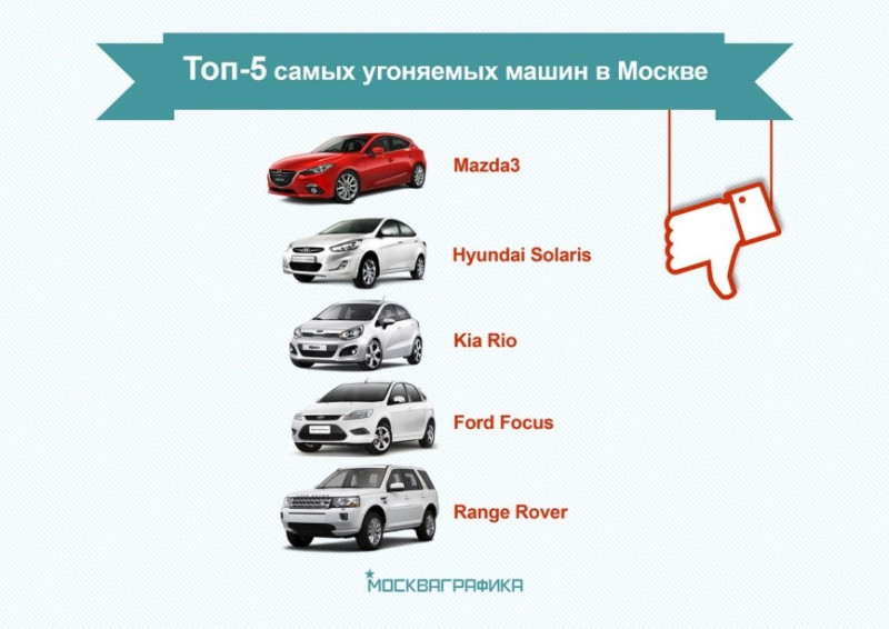 Исследование провели на основе соотношения количества угнанных машин к общему числу застрахованных в компании автомобилей конкретной марки.На внедорожник Toyota RAV4, занявший первое место в рейтинге, приходится 14% от всех угонов за последние шесть месяцев. На второй строчке Toyota Camry (13%), на третьей Hyundai Solaris (пять процентов). Четвертое и пятое места у Hyundai Tucson и Kia Sportage с таким же показателем — пять процентов.В первую десятку также вошли: Kia Rio (четыре процента), Hyundai Creta (три), Kia Ceed (три), Kia Sorento (три) и Lexus RX300 (три).