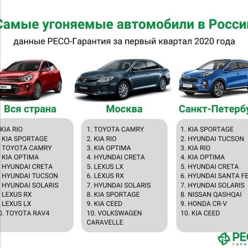 ru оказались отчеты крупнейших страховых компаний России, которые продают полисы каско. По данным компаний «АльфаСтрахование», «Согласие», «МАКС», «Ренессанс», «РЕСО-Гарантия» и «Страховой дом ВСК», в список самых угоняемых автомобилей в России в 2019 году, помимо Toyota и Lexus, вошли корейские модели, причем не только бюджетного сегмента.