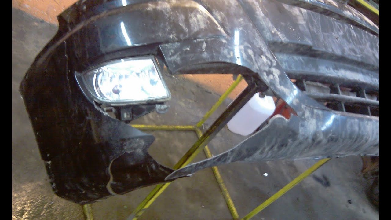 Для этого бампер нужно хорошенько промыть и очистить от остатков грязи. Далее края и кромки детали обрабатываются абразивным инструментом для увеличения контакта и прочности соединения.