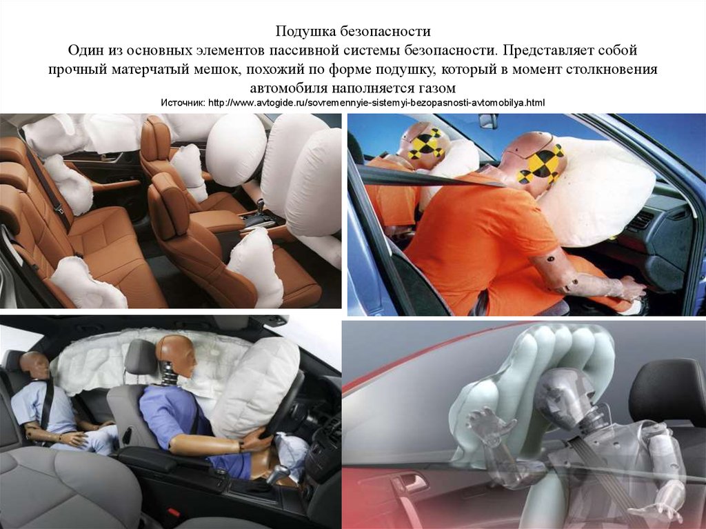 Подобные пассивные средства безопасности требовали улучшений, которые пришли в виде многоточёчных ремней. Повышенная функциональность такого типа устройств позволяла равномерно распределить кинетику по всему телу, не подвергая травматизации отдельных областей тела. - Подушки безопасности – вторая по важности (первую строчку здесь уверенно удерживают пояса безопасности), пассивная система безопасности. Получив признание в конце 70-ых гг. они плотно вошли в состав всех транспортных средств. Современный автопром начали оснащать целым набором из систем подушек безопасности, которые окружают водителя и пассажиров со всех сторон, перекрывая потенциальные зоны повреждений. Резкое раскрывание камеры с хранением подушки активирует стремительное наполнение последней воздушной смесью, которая амортизирует приближающегося по инерции человека.