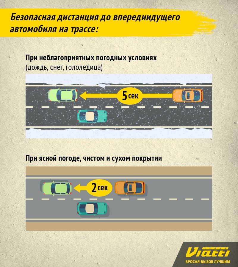 Принято считать, что на сухой дороге или на асфальте после дождя безопасная дистанция между автомобилями по ПДД должна составлять минимум 2 секунды. Если асфальт грязный и на нем много глины или пыли, то дистанция должна соответствовать 3 секундам. В случае если снег укатанный, то подойдет дистанция и в 3 секунды, однако опытные водители советуют новичкам выдерживать большую дистанцию. Если на дорогах прошел снег с дождем и все осадки за ночь замерзли, то самой безопасной дистанцией будет расстояние минимум в 5 секунд.