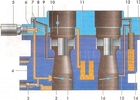 Из этого отверстия эмульсия попадает во входное отверстие 5 в корпусе карбюратора, откуда по системе каналов поступает к выходному отверстию 3 у кромки дроссельной заслонки вторичной камеры.