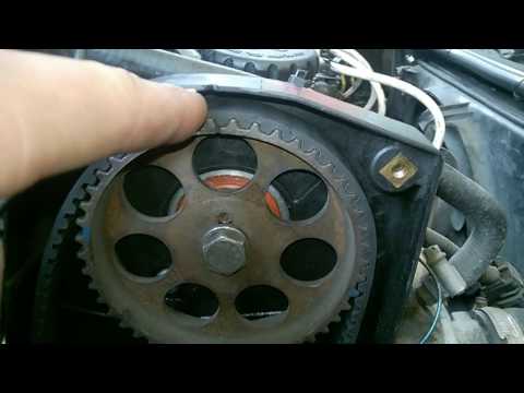 Есть 3 метки, расположенные близко друг к другу. Средняя отметка находится за 16 градусов до верхней мертвой точки, и это базовое время, требуемое производителем. Если метки не совпадают, ослабьте два болта крепления распределителя к головке блока цилиндров и поверните распределитель, следя за установочными метками. Когда метка на шкиве совпадет с указателем, затяните болты распределителя и выключите двигатель.