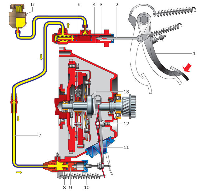 Вилка давит на выжимной подшипник, который находится на первичном валу КП. Подшипник двигается по валу и нажимает на пружину диафрагменного типа, которая уходит вглубь корзины и давит на нажимной диск, который, в свою очередь, отходит, перестает поджимать ведомый диск, в результате чего прекращается передача вращения, то есть мотор отсоединяется от КПП.