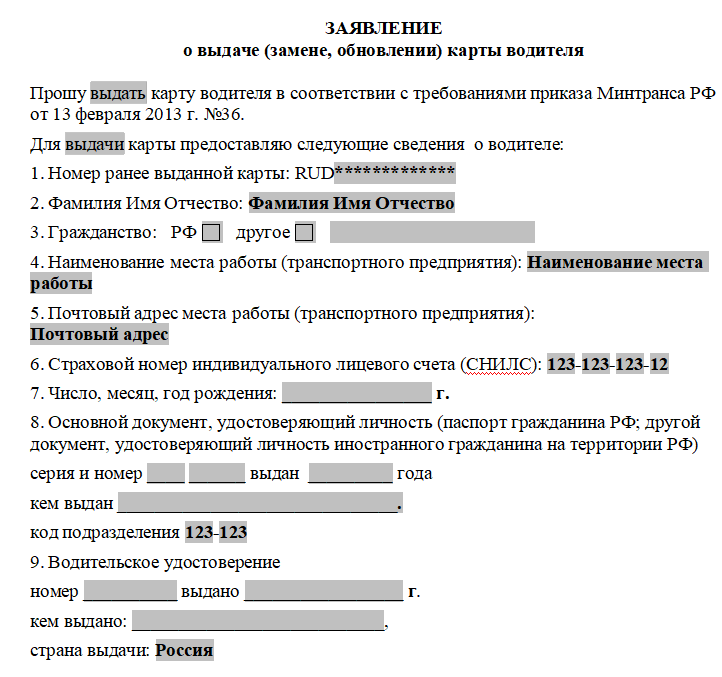 Кроме пакета документации водитель, на которого оформляется тахокарта, заполняет заявление по утвержденной форме.