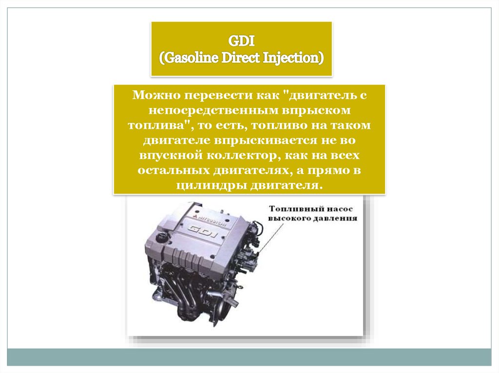 Их обычно называют двигателями GDI. Эти двигатели работают за счет топливных форсунок, впрыскивающих топливо под высоким давлением непосредственно в камеру сгорания. Это может быть более точным, чем старые системы впрыска топлива. Эти системы обеспечивают большую эффективность использования топлива и меньше выбросов.