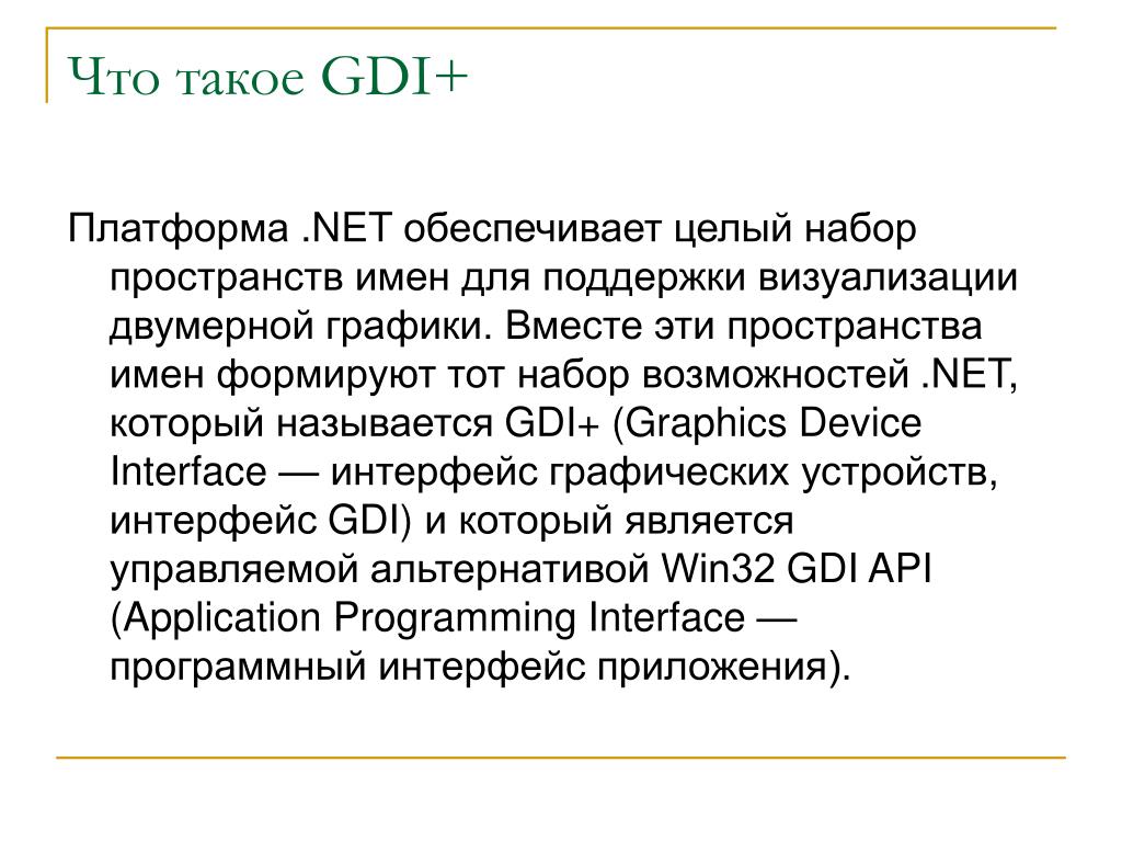 Когда приложению необходимо отобразить или распечатать, оно вызывает функцию GDI и отправляет ей параметры объекта, который необходимо создать. GDI, в свою очередь, «рисует» объект, отправляя команды на экран и драйверы принтера, которые фактически отображают изображения.