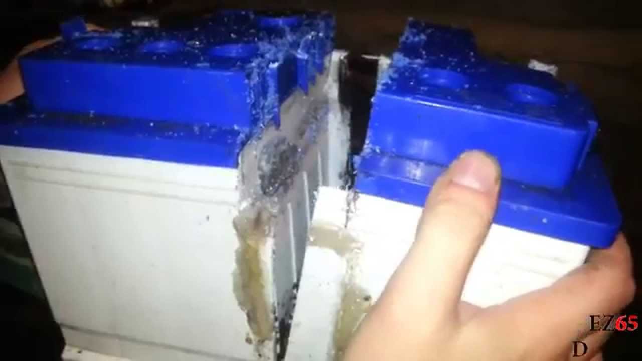 Традиционно аккумулятор состоит из чередования положительных и отрицательных пластин, между которыми находится электролит. На Фото 1 в разрезе показана одна секция (банка) где отогнутая отрицательная пластина, видны остатки высохшего электролита в виде белого покрытия, сепаратор (он нужен для разделения пластин) и сильно сульфатированной положительной пластины. Мы распилили уже не рабочий АКБ, в новом аккумуляторе положительная пластина имеет серый (свинец) цвет. На фото видно, как плотно пластины «набиты» в секции. Чем больше набивка пластин, их кол-во, тем лучше батарея по качеству! Чем больше количество — тем больше вес, поэтому при выборе батареи можно косвенно ориентироваться на вес. На фото батарея RDrive 6 DZF 12.