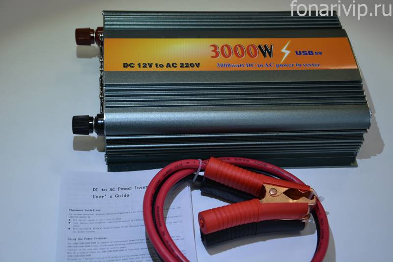 Синусоидальный инвертор 12-220 В, мощностью 3000 Вт. Допускается перегрузка инвертора до 6000 Вт в течение 2 сек. Рабочий диапазон входного напряжения от АКБ: 10,5 — 14,5 В. Есть режим энергосбережения. Корпус металлический.