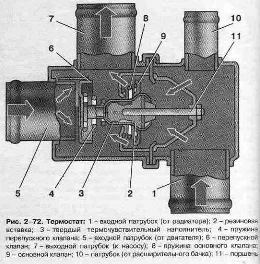 Конструкция термостата представляет собой металлический или пластиковый корпус, внутрь которого помещается воскообразное вещество. Внутри этого материала находится шток, обеспечивающий работу клапана устройства. При повышении температуры воскообразное вещество выталкивает шток, благодаря чему обеспечивается распределение антифриза по разным контурам.