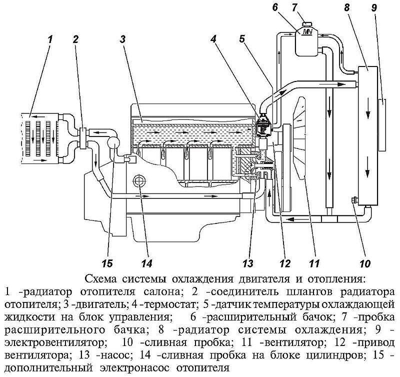 9051 движения цикл, проталкиваемый через двигатель водяным насосом. Двигатель содержит внутренние полые конструкции, называемые водяными рубашками. Через них охлаждающая жидкость течет внутрь двигателя, поглощая тепло двигателя. Затем он проходит по шлангам к радиатору, где охлаждается. Оттуда он возвращается в двигатель, где вытесняет горячую охлаждающую жидкость, чтобы повторить процесс.