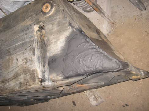 Автомобильный бак подготавливается надлежащим образом к работе. Область вокруг повреждения следует хорошо зачистить и обезжирить. Для обработки используется ортофосфорная кислота (20%). Далее подготавливаются оцинкованные заплатки и припаиваются на место пробоя.