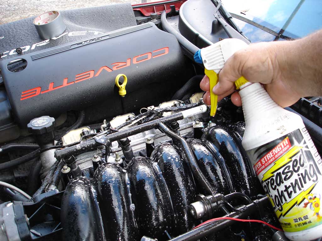 По усмотрению необходимо приобрести в автомагазине спрей, желательно не из дешёвых, не нужно жалеть денег: лучше купить немного дороже – это будет более качественный товар. Можно купить штатский спрей либо какой-нибудь другой фирмы. Обрабатывать двигатель нужно холодным. Согласно инструкции на баллончике, спустя 35-40 минут смыть подогретой водой. Если есть возможность, то лучше всего сделать это из шланга, большой струёй.