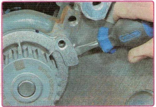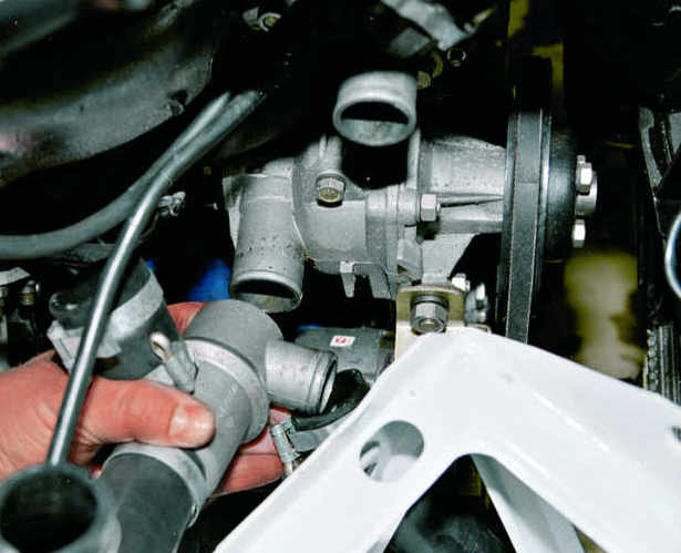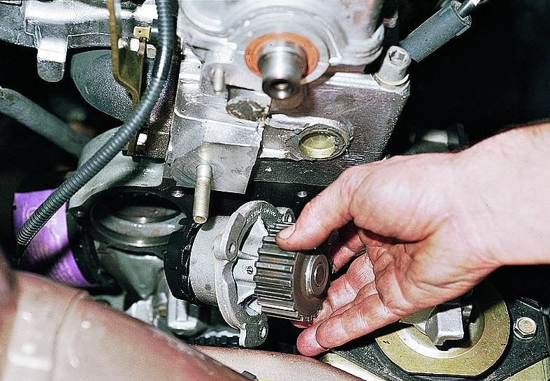 При полностью рабочем насосе вы будете ощущать создаваемое им давление. Обычно, это ощущается в виде достаточно сильных толчков. Если они есть, то проблем с водяной помпой нет никаких; - Если толчки слабые или полностью отсутствуют, то нужно перейти к более тщательному осмотру помпы. Заглушите мотор, на некоторых моделях потребуется демонтировать кожух привода ГРМ. Обращайте внимание на наличие подтеканий возле места крепления насоса, также антифриз может вытекать через сальник шкива. Если имеются такие признаки, то однозначно требуется снятие помпы и ее дефектовка.