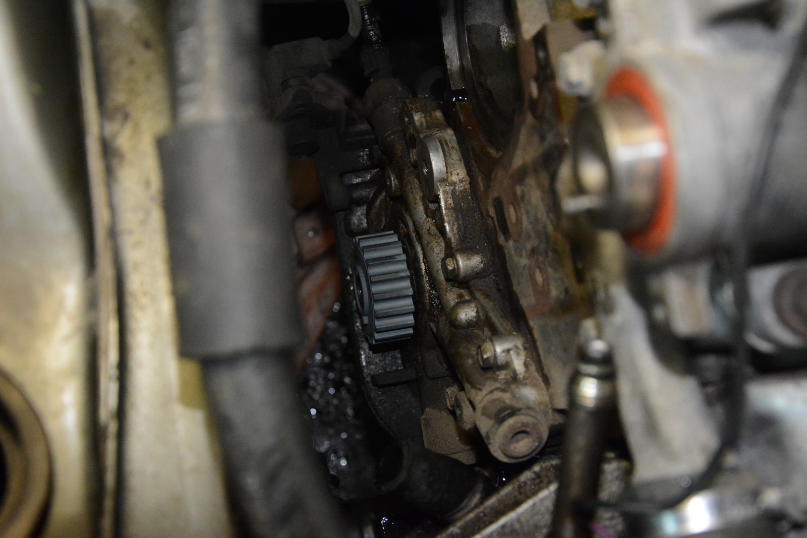 - Если во время работы мотора слышен характерный звук неисправного подшипника, необходимо проверить помпу на наличие люфта в районе вала. Просто покачайте шестерню привода помпы. Иногда всё «лечится» банальной заменой подшипника.