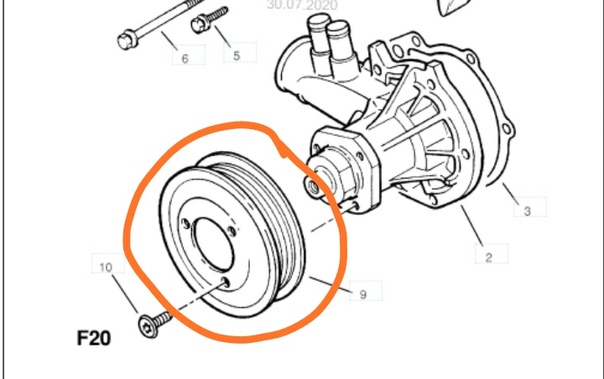 Выполняется из металла для обеспечения требуемых прочностных параметров. Непрерывно вращаясь, крыльчатка нагнетает необходимое давление в контуре движения охлаждающей жидкости. - Шкив: передаёт вращательный импульс непосредственно от коленвала на крыльчатку. Благодаря шкиву сохраняется рабочий диапазон вращения крыльчатки. Использование шкива выгодно с конструктивной точки зрения: проскальзывание приводного ремня сводится к минимуму.