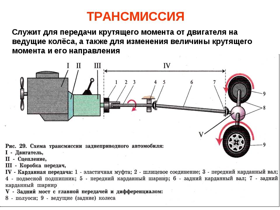Крутящий момент от мотора автомобиля к колесам передают следующие детали и узлы: