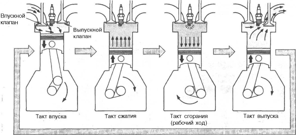 Двигатель, который завершает рабочий такт за четыре хода поршня, называется четырехтактным двигателем.