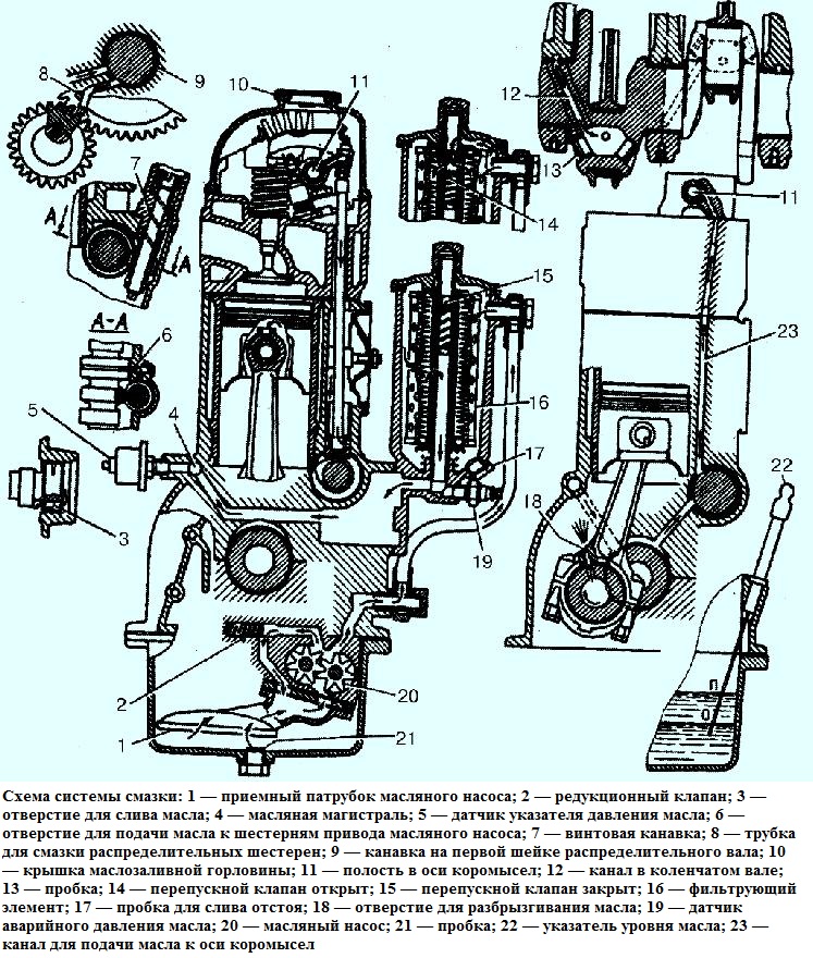 В систему смазки входят масляный насос 20 с приемным патрубком и редукционным клапаном (установлен внутри масляного картера), масляные каналы, масляный фильтр с перепускным клапаном, масляный картер, указатель уровня масла, крышка маслозаливной горловины, датчик указателя давления масла, датчик сигнализатора аварийного давления масла.