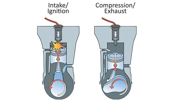 Другими словами, двухтактные двигатели работают при вращении коленчатого вала на 360°, тогда как четырехтактные двигатели работают при 720° вращения коленчатого вала.