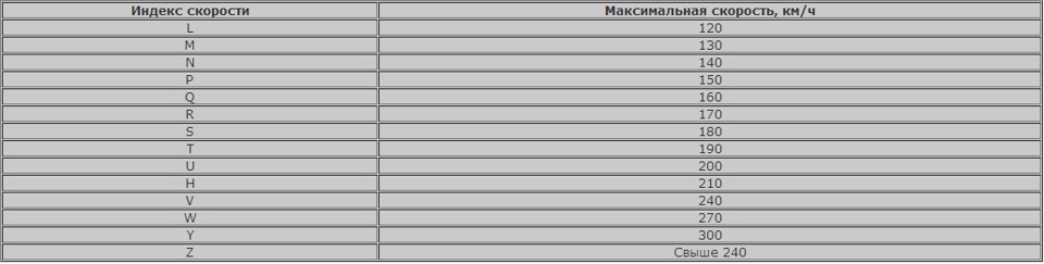 Индекс скорости шины при маркировке обозначается одной из букв латинского алфавита, которая следует сразу за индексом нагрузки. Для его расшифровки обычно также пользуются таблицей.