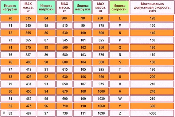 Индексы скорости и нагрузки шин: понятия, маркировка, таблицы