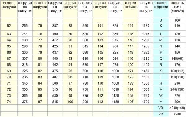 Индекс скорости шин напрямую связан с индексом нагрузки. Это численное представление величины нагрузки, на которую рассчитана автопокрышка при номинальном значении. Важно: все индексы нагрузки указываются относительно максимальной величины индекса скорости.